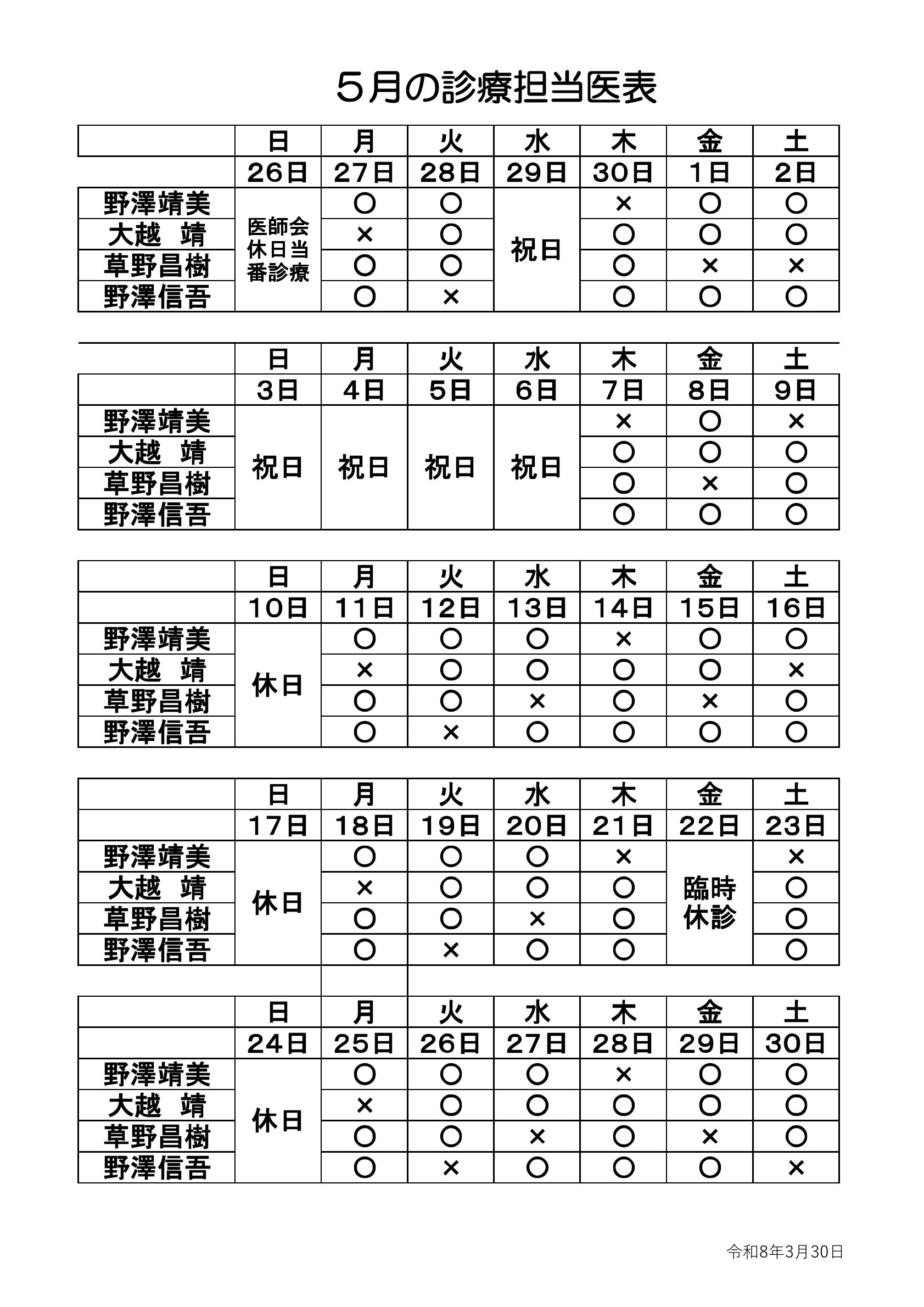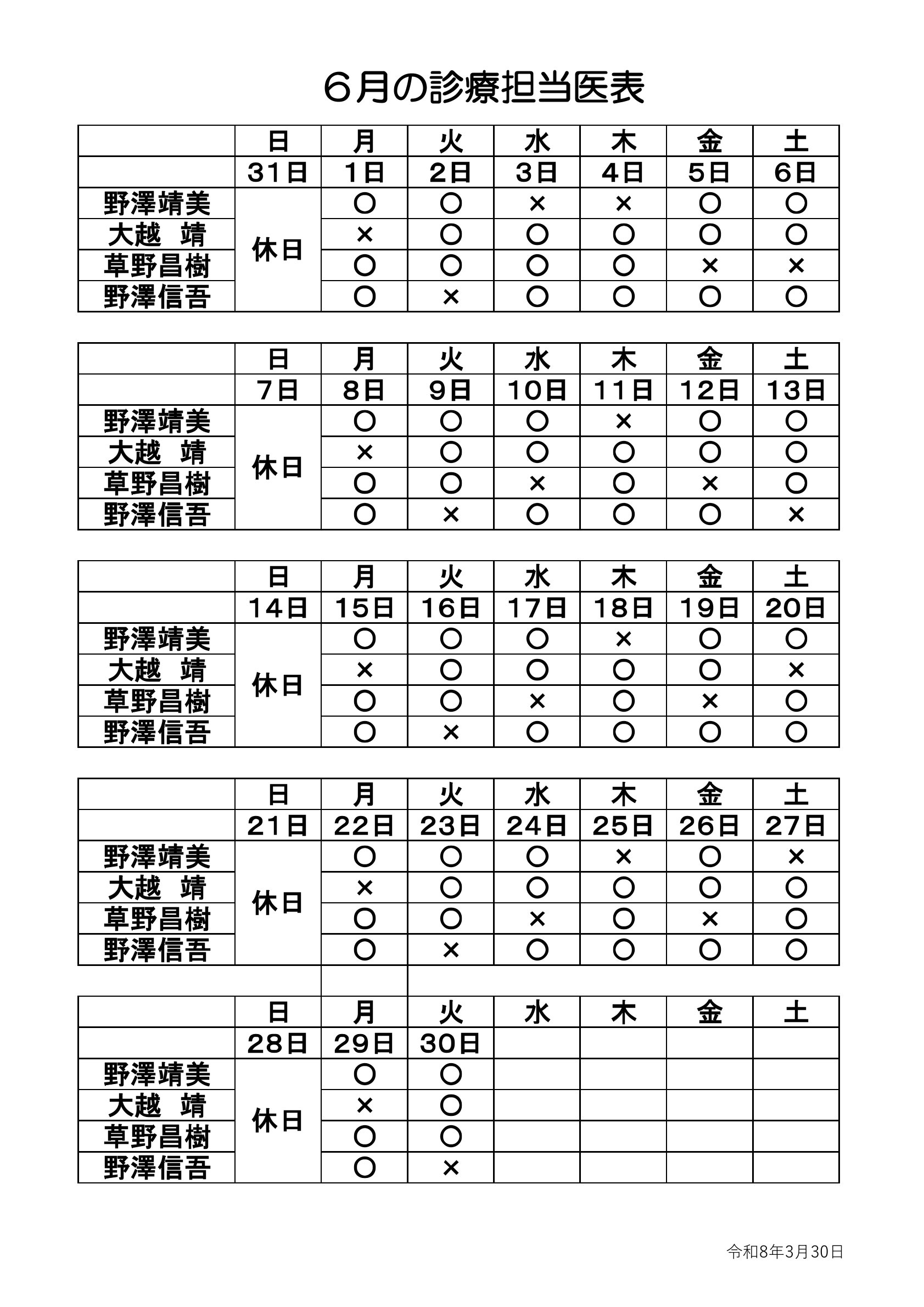 2026年4月1日 / 最終更新日 : 2026年4月1日 webmaster 診療担当医 4〜6月の診療担当医をお知らせします 4〜6月の診療担当医 のざわ内科クリニックへのお問い合せお電話の対応時間 月・火・木・金 [午前] 8:30〜12:00 [午後] 14:00〜18:00 水・土 [午前] 8:30〜12:00 ※休診:水・土 [午後] 日曜・祝日お問い合せはこちら